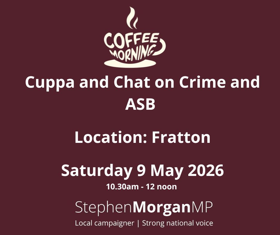 Stephen Morgan MP is inviting constituents to his next Cuppa and Chat event on Saturday 9 May to discuss tackling crime and ASB in Portsmouth, and what action can be taken.